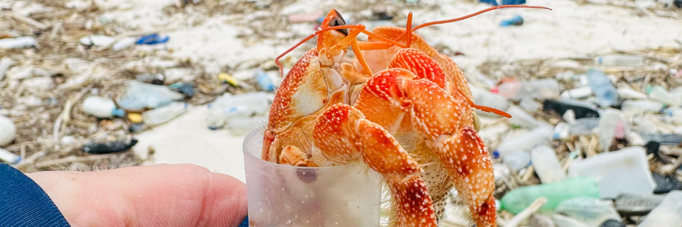 Whilst visiting the Maldives in 2025, we witnessed hermit crabs living in plastic containers, miles of plastic